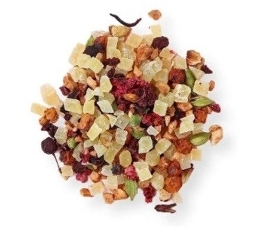 Пряный напиток из каркаде, цукатов клубники, малины, ананаса, боярышника, рябины со специями и кусочками яблок.