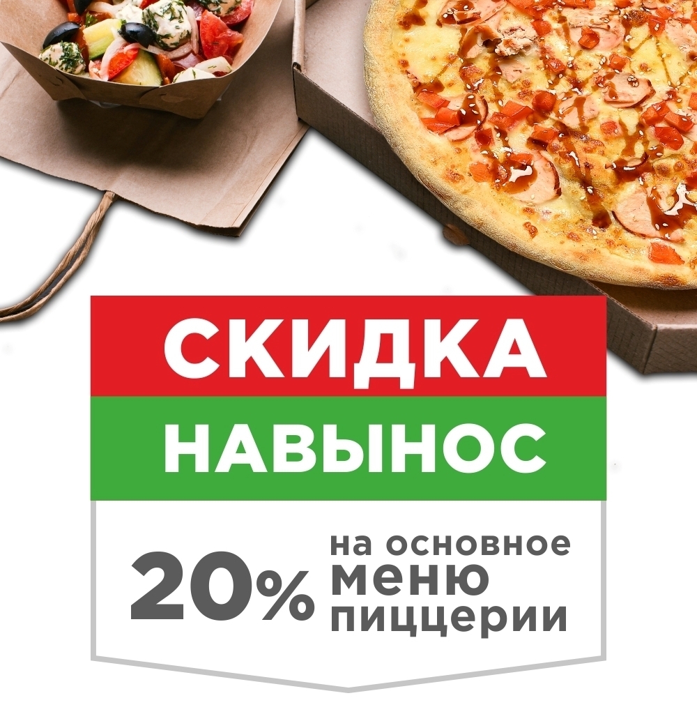 МЫ УВЕЛИЧИЛИ СКИДКУ! Закажите навынос пиццу, роллы и другие блюда из ОСНОВНОГО МЕНЮ и получите скидку 20%! Подробности уточняйте у официантов пиццерии.